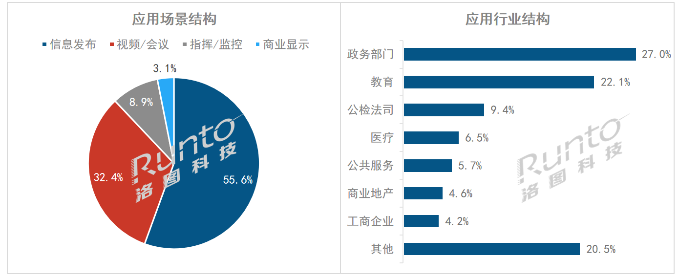 根據(jù)洛圖科技(RUNTO)調(diào)研數(shù)據(jù)顯示,2024年第一季度,小間距LED顯示屏在信息發(fā)布場景的出貨面積占比變?yōu)槭孜,同比增長22個百分點,達到55.6%;視頻會議場景應(yīng)用變?yōu)榈诙鲐浢娣e的占比為32.4%。