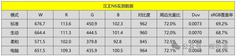在標(biāo)準(zhǔn)模式下,漢王N6的亮度達(dá)到了676流明,而目前市面上2000元級別的智能微投,基本在500流明以下(智能微投領(lǐng)域虛標(biāo)較嚴(yán)重,我們以實(shí)際的亮度為準(zhǔn));測試出標(biāo)準(zhǔn)情況下對比度為962,色域達(dá)到了近70%,基本也是屬于中等偏上的水準(zhǔn)。(在柔和模式下,為了更加護(hù)眼,各項(xiàng)數(shù)值有所降低)