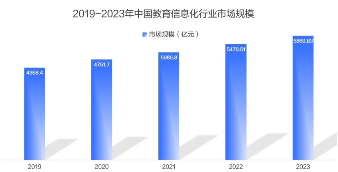 隨著學校、家庭對教育質(zhì)量認知的深刻轉(zhuǎn)變及消費偏好的高端化演進,教育智能硬件市場迎來了前所未有的發(fā)展機遇,需求量井噴。在此背景下,教育智能硬件市場呈現(xiàn)出爆發(fā)式增長態(tài)勢。據(jù)權(quán)威數(shù)據(jù)分析,2019年至2023年期間,中國教育信息化市場規(guī)模從4368.4億元增長至5869.83億元,年均增速超7%。當前,我國教育信息化市場仍存在尚未被滿足的需求,行業(yè)市場容量已接近萬億級別。