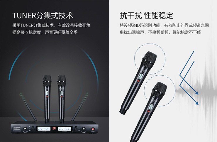 對(duì)于無(wú)線麥克風(fēng)而言,最重要的莫過(guò)于它的穩(wěn)定性,TS-8808HH采用TUNER分集式技術(shù),提高接收穩(wěn)定度,有效改善接收死角,同時(shí)特設(shè)頻道ID碼識(shí)別功能,有效防止外界或頻道之間串?dāng)_出現(xiàn)的噪聲,提供可靠、穩(wěn)定、信號(hào)覆蓋更寬廣的無(wú)線拾音輸出。