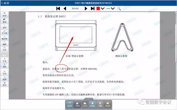 1. SVS無紙化會(huì)議系統(tǒng)硬件上配置了高清超薄液晶屏升降設(shè)備,這個(gè)液晶屏與一般普通辦公用的顯示屏可不一樣,它采用的是雙面屏設(shè)計(jì),前面的主屏顯示會(huì)議內(nèi)容,IPS全視角顯示,支持多點(diǎn)觸摸操控,經(jīng)過筆者體驗(yàn),在17寸的觸摸屏上操作還挺靈敏,能很快上手適應(yīng)。該顯示屏背面還配有一個(gè)10寸桌牌副屏,主要顯示參會(huì)人員的姓名、職位等信息,桌牌整體顯示醒目,而且后臺(tái)信息編輯方便,可統(tǒng)一修改格式字體等,電子化桌牌替代了傳統(tǒng)的紙質(zhì)桌牌,彰顯科技環(huán)保。