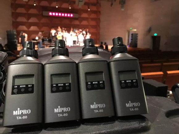 對于人聲演唱部分,使用了8通道的MIPRO ACT-848數(shù)字無線系統(tǒng)搭配頭戴話筒使用。另外,針對團體大合唱拾音部分,使用了4通道的TA-80插入式發(fā)射器將有線話筒轉為無線話筒使用。