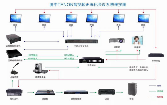 根據(jù)用戶的使用需求,本次會(huì)議室設(shè)計(jì)一套無紙化會(huì)議系統(tǒng),根據(jù)會(huì)議室的布局,在會(huì)議室每個(gè)座位設(shè)計(jì)一臺液晶升降一體機(jī),安裝無紙化軟件;同時(shí)設(shè)計(jì)一臺無紙化控制主機(jī),作為系統(tǒng)的管理和控制中心,無紙化平板電腦通過無線網(wǎng)絡(luò)與無紙化控制主機(jī)連接,組成一套完整的智能交互式無紙化會(huì)議系統(tǒng)。