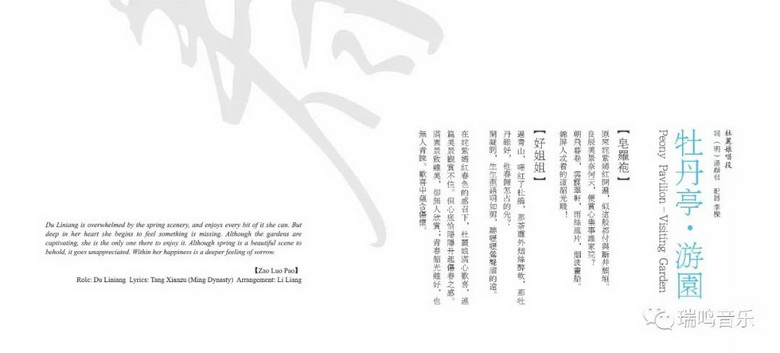 文中音樂(lè)步步嬌 《牡丹亭·游園》來(lái)自瑞鳴音樂(lè)專輯《春色如許》!赌档ね•游園》 杜麗娘唱段 詞:(明)湯顯祖 配器:李樑【步步嬌】裊晴絲吹來(lái)閑庭院,搖漾春如線。停半晌,整花鈿。沒(méi)揣菱花,偷人半面,迤逗的彩云偏。步香閨怎便把全身現(xiàn)!【醉扶歸】你道翠生生出落的裙衫兒茜,艷晶晶花簪八寶瑱?芍乙簧鷲(ài)好是天然?恰三春好處無(wú)人見(jiàn),不提防沉魚落雁鳥驚喧,則怕的羞花閉月花愁顫。大家閨秀杜麗娘移步出閨初入庭院,陶醉于春的氣息中。她一步三停,整理端莊,從鏡中發(fā)現(xiàn)了自己的俊美,一身的教養(yǎng)、風(fēng)情、韻致,如在眼前。