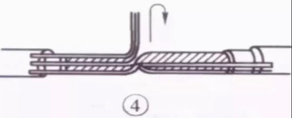 把3根線芯的一組在干線右邊按順時(shí)針方向緊緊纏繞3~4圈,并鉗平線端;把4根芯線的一組在干線的左邊按逆時(shí)針方向纏繞4~5圈。